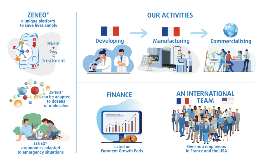 The versatile ZENEO® platform is designed to enable untrained patients or caregivers to easily and instantly administer a wide range of emergency medications via intramuscular injection, either on bare skin or through clothing. The company is also developing additional products focused on treating allergic shocks, adrenal insufficiency, and other emergency medicine indications, as well as therapies for other critical conditions.